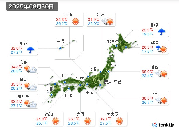 上記の通り名古屋が39度、東京が38度のとき札幌は23度です。